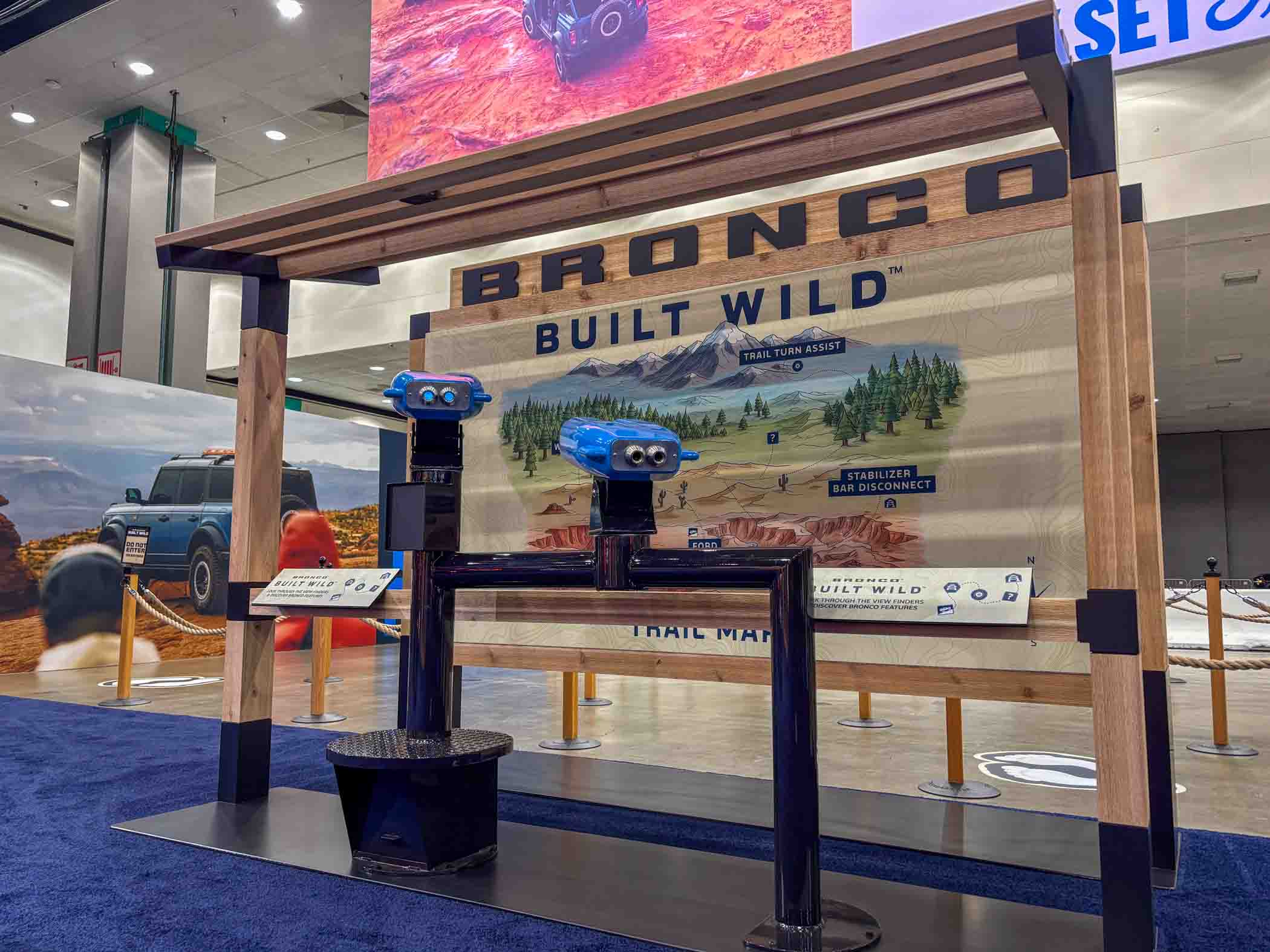 Ford leaned in hard on adventure and performance. The Mustang GTD made its presence known with a performance-first attitude, but the real draw was the Bronco Mountain course — a 38-degree indoor off-road simulation that let attendees feel what rugged driving is like, first-hand. An added touch included viewfinders built with AR tech to use a housed screen that would show demo videos of various features of the Bronco – a great thematic nod to their wilderness design.